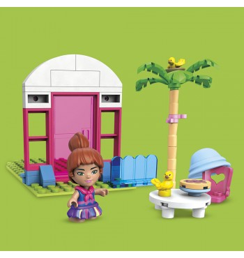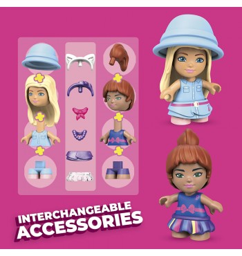 Set includes 2 small Barbie™ dolls, 1 dog, 2 birds, 303 bricks with special pieces and accessories and 5 bases to build